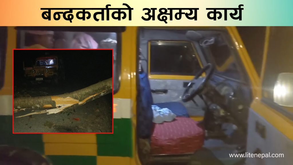 काठमाडौं । अहिले सामाजिक सञ्जालमा एउटा भिडियो र केही फोटोहरू भाइरल छन् । भिडियो र फोटोमा हेर्दा मध्यरात देखिन्छ । एम्बुलेन्समा कोही रोइरहेको आवाज सुनिन्छ । अनि, एम्बुलेन्स दौडने सडकमा ढलेका रुख छन् । घटना मंगलबार विहानको राती करिब २ बजेको भएको बताइएको छ । पाथीभरामा केबलकार निर्माण प्रक्रियाको विरोध गरिरहेको ‘नो केबलकार समूह’ले मेची … Continue reading बन्दकर्ताले सुनेनन् बिरामीको कारुणिक चित्कार (भिडियोसहित)
