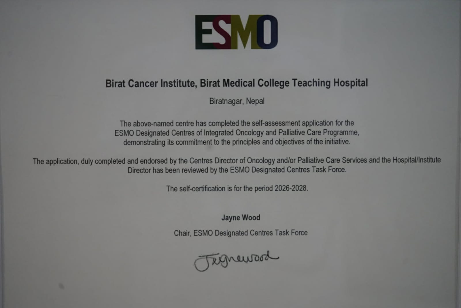 युरोपेली सोसाइटी फर मेडिकल ओन्कोलोजी (ESMO) बाट आधिकारिक मान्यता प्राप्त गर्दै विराट क्यान्सर इन्स्टिच्युट नेपालको पहिलो संस्था बनेको हो। जर्मनीको बर्लिनमा गत अक्टोबर १७ देखि २१ सम्म आयोजित विशेष कार्यक्रममा उक्त संस्थालाई एकीकृत ओन्कोलोजी र प्यालिएटिभ केयर ESMO नियुक्त केन्द्रको रूपमा अवार्ड प्रदान गरिएको हो। क्यान्सर इन्स्टिच्युटले सन् २०२६ देखि २०२८ सम्मका लागि ESMO नियुक्त केन्द्रको रूपमा मान्यता प्राप्त गरेको छ।