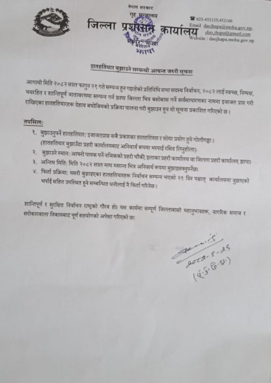 झापा । जिल्ला प्रशासन कार्यालय झापाले आगामी फागुन २१ गते हुने प्रतिनिधि सभा सदस्य निर्वाचनलाई स्वच्छ, निष्पक्ष, भयरहित र शान्तिपूर्ण वातावरणमा सम्पन्न गराउने उद्देश्यले इजाजत प्राप्त हातहतियार माघ मसान्तभित्र बुझाउन सार्वजनिक सूचना जारी गरेको छ ।