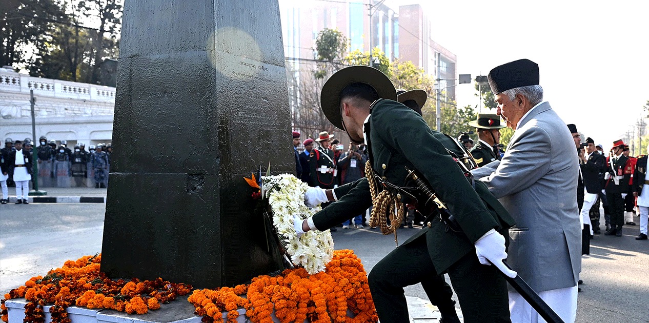 काठमाडौं । राष्ट्रपति रामचन्द्र पौडेलले राष्ट्र निर्माता पृथ्वीनारायण शाहप्रति सम्मान व्यक्त गरेका छन् । सिंहदरवारको पश्चिमद्वार नजिक रहेको राष्ट्र निर्माताको सालिकमा पुष्पहार अर्पण गरी उनको योगदानको सम्मान गरेका हुन् । त्यस अवसरमा नेपाली सेनाको एक टुकडीले राष्ट्रपतिप्रति सलामी अर्पण गरेको थियो । पृथ्वी जयन्ती तथा राष्ट्रिय एकता दिवसका अवसरमा आयोजित उक्त समारोहमा उपराष्ट्रपति रामसहायप्रसाद यादव, […]